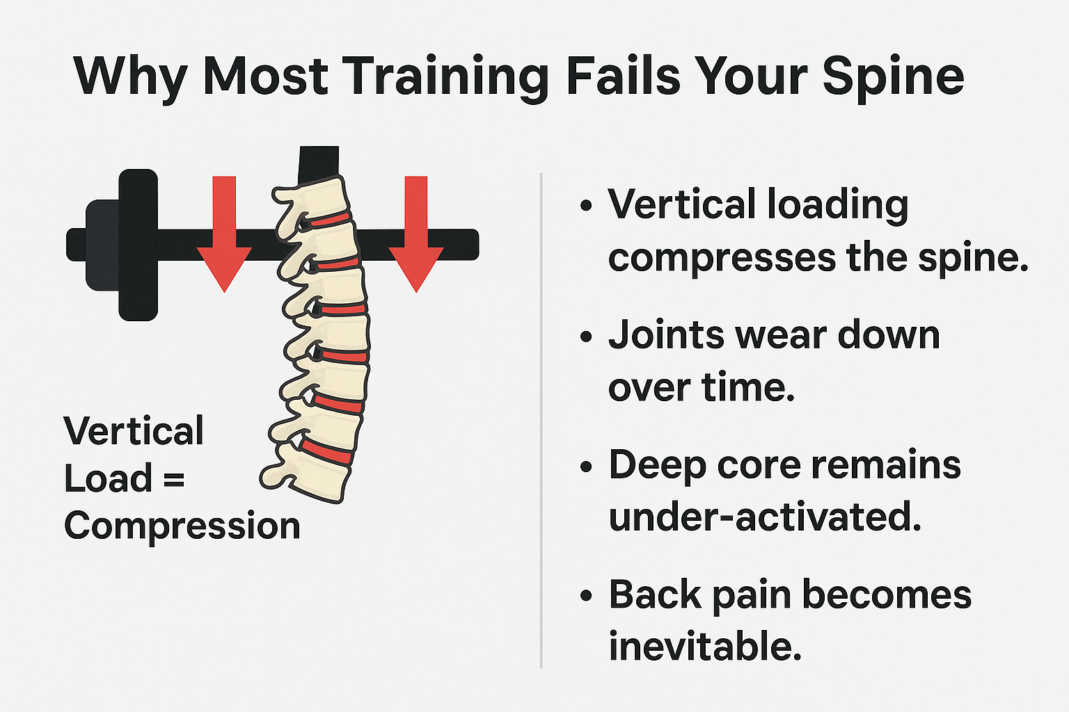 - Conventional training overloads the spine with excessive compressive force.